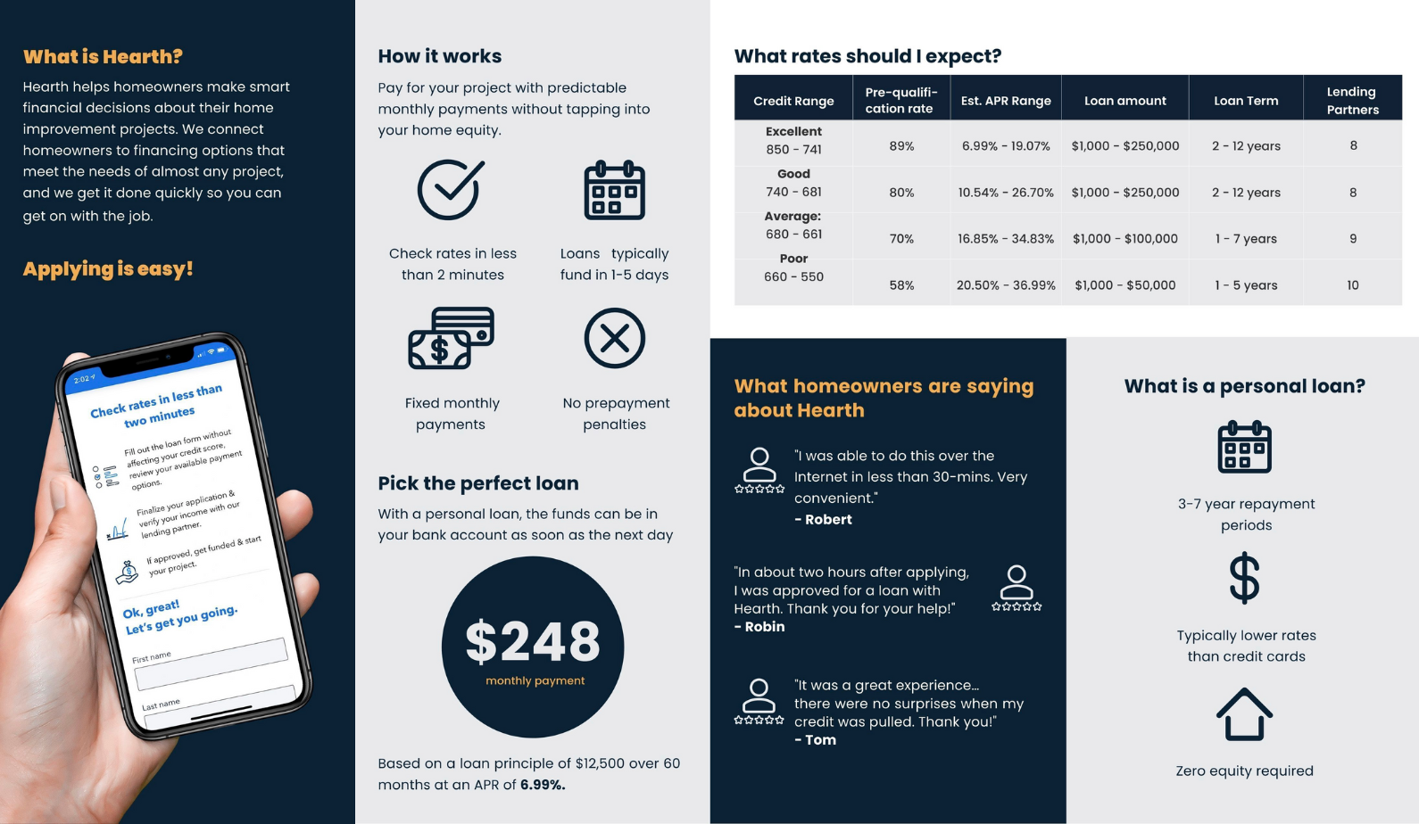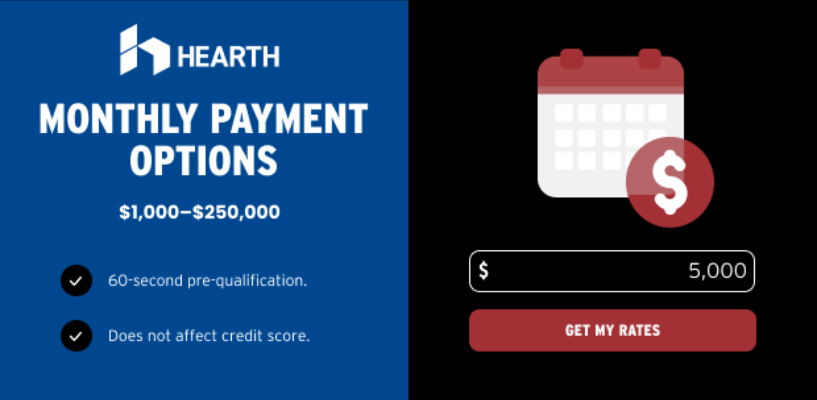 - Flexible terms: Want to keep your monthly payment under a certain number? Need to pay off the project within a set time frame? Hearth lets you compare both scenarios side by side.